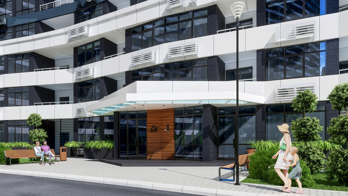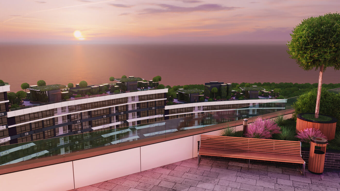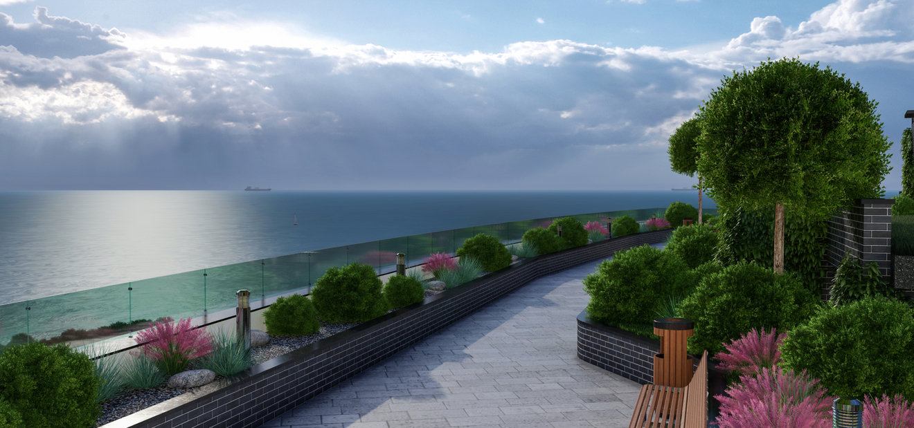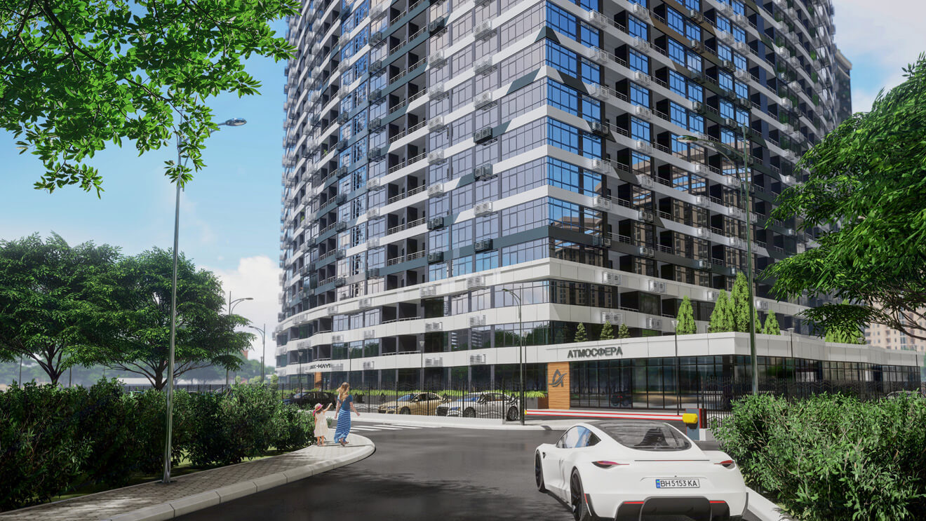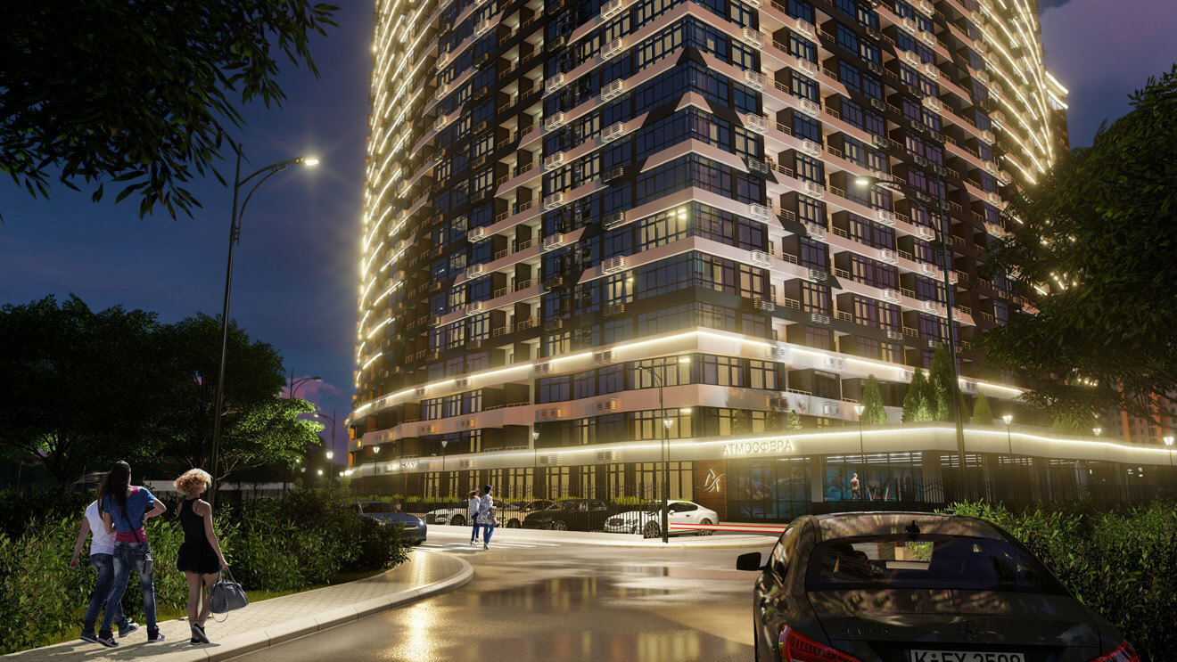 Архитектурное решение проекта АТМОСФЕРА учитывает прибрежное расположение жилого комплекса. Фасад здания призван давать жителям оптимальное количество солнечного света и максимальное – свежего морского воздуха. А форма дома идеально создаёт локальный внутренний двор. Она напоминает океанский лайнер и отражает философию проекта: скользить по жизни, как по морской глади.